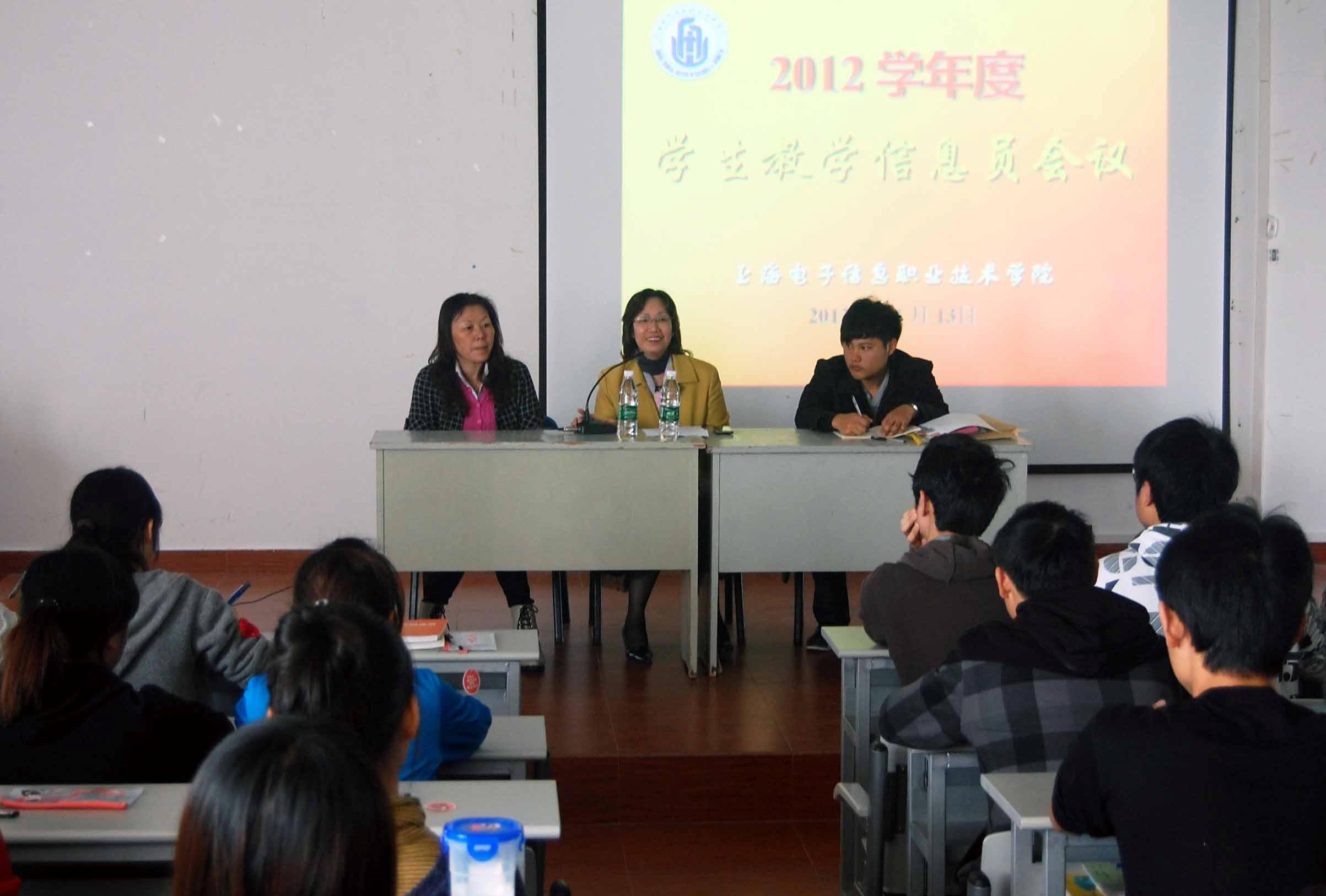 吴蓉频老师介绍了学院学生教学信息员组织的构架,学生教学信息员工作职责和任职条件、对信息员开展工作的细节,如组织开展学生座谈会,加强院系学习部之间的交流作了布置;对信息员的工作态度,如积极性,及时性,实事求是等提出了要求。作为上一届学生教学信息员代表,机电工程系11级数控专业的赖骏同学发言,交流了他担任教学信息员的工作体会,让所有信息员感到有责任以自己良好的学习习惯来带动全班的学习氛围。戴玉珍、吴蓉频老师给新一届信息员发放了聘书和纪念品,最后戴老师代表学院感谢过去一年学生教学信息员的辛勤付出,希望新的学年度他们能以更加积极的态度开展工作,以主人翁的姿态投入到学院创建骨干院校的活动中。