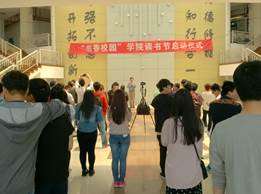 为引导师生们走进图书馆,激发学生们的读书热情,徐松鹤副院长首先就读书的目的和意义展开深刻的探讨,他说中华民族历来是一个爱好读书的民族,在新的世界都数日来临之际,希望全校同学积极主动地投入到读书活动中去,为中华民族的伟大复兴而刻苦奋斗,希望同学们用心去感受书中的正能量,鼓励大家热爱阅读、无悔人生。随后,图文信息中心相主任介绍了本届读书节的目的和意义,为到场师生讲解了“2015年度校园读书节——具体活动安排”并向广大师生发出了“走进图书馆,共建书香校园”的倡议。