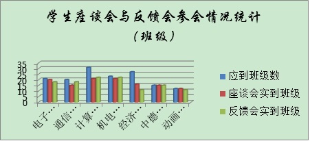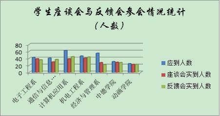 | 序号 | 系别 | 应到班级数 | 应到人数 | 座谈会实到班级 | 座谈会参会率 | 实到人数 | 参会率 | 反馈会实到班级 | 反馈会参会率 | 实到人数 | 参会率 |