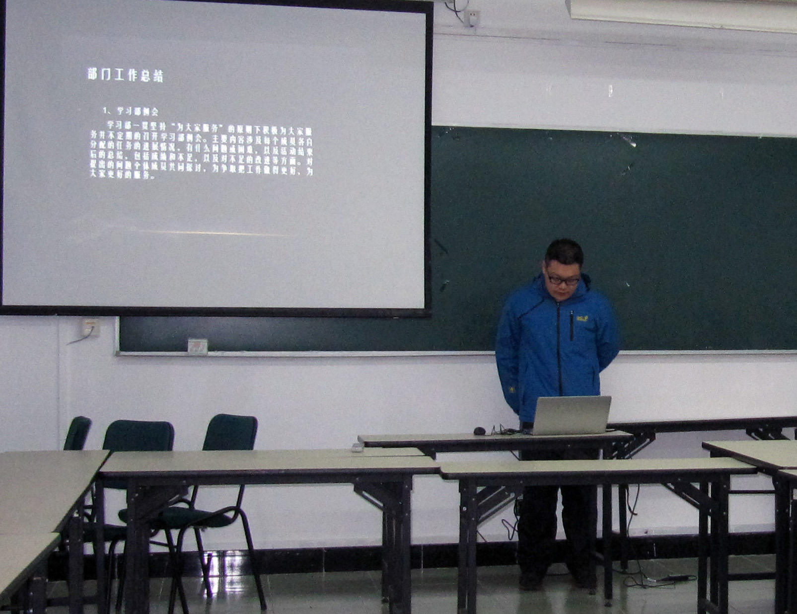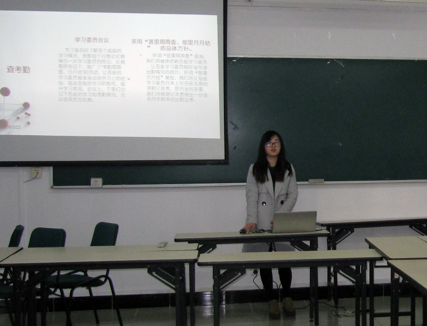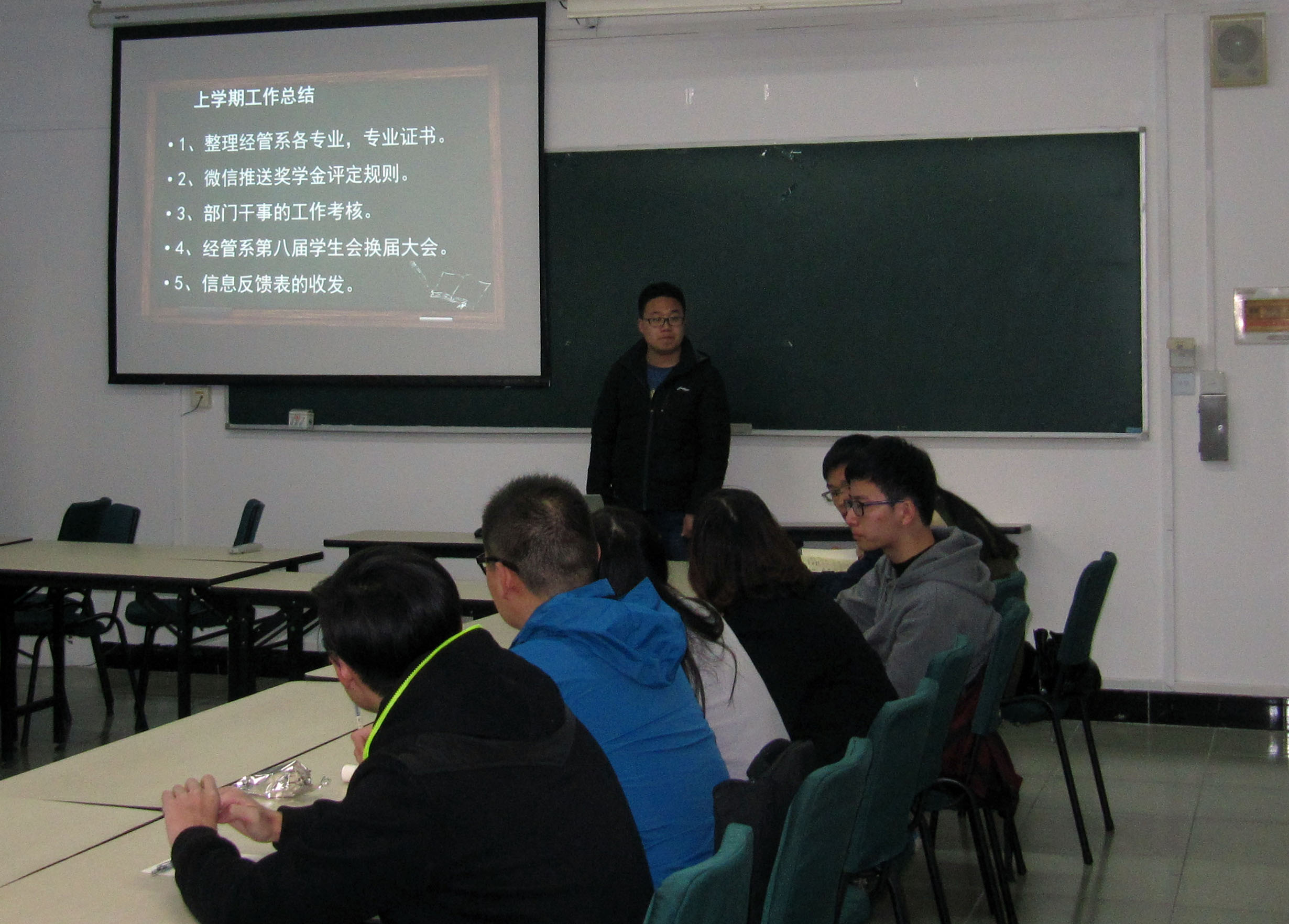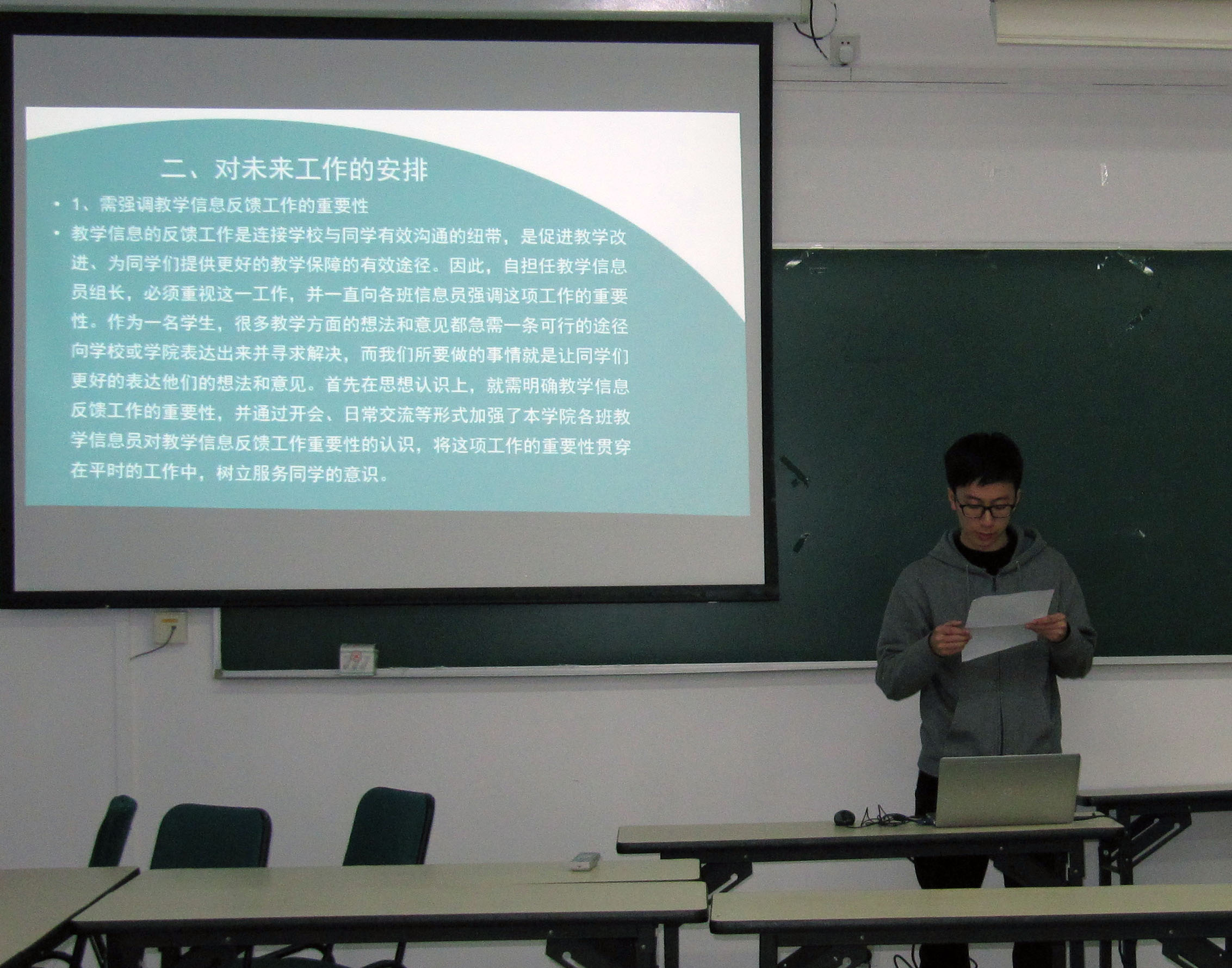 戴玉珍老师对交流演讲作了点评,称赞同学们在学生教学信息员工作方面进步显著。同时布置了本学期工作,并对教学信息员反馈意见表、学风检查、推优及带新四项工作提出了具体要求。