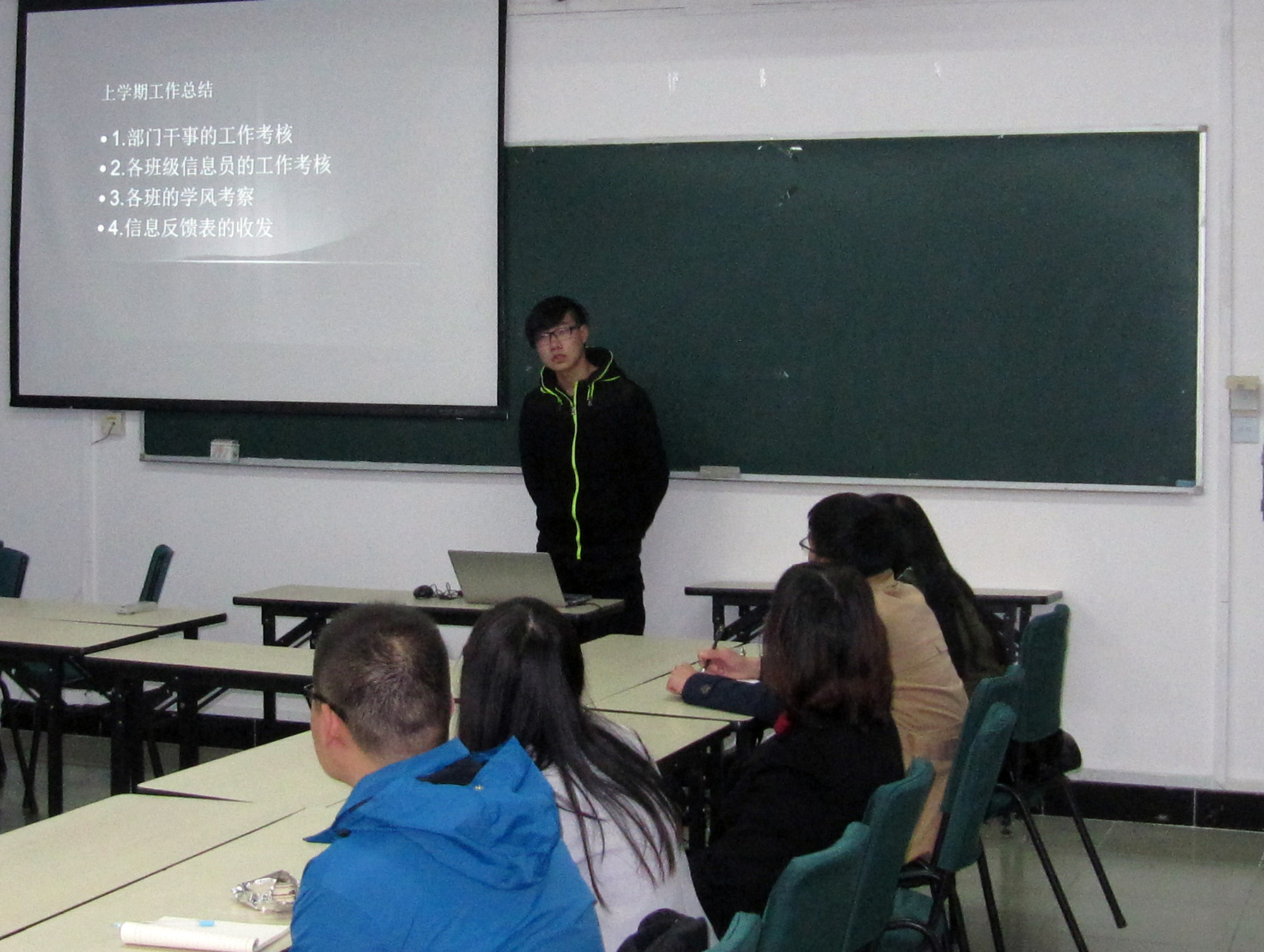 会上,各系(二级学院)学习部长和院学习部长就2015~2016学年第一学期的学生教学信息员工作总结与本学期的工作打算,进行了交流。与会同学都做了精心准备,并认真制作了PPT,电子工程系尤为突出。同学们总结了教学信息反馈和学风检查工作开展情况,展示了成果、查找了不足、交流了体会。各系(二级学院)都有各自的工作特色:如电子工程系采用“班里周周查、部里月月结”方法查考勤;计算机应用系成立“电脑医院”,为全院师生提供便利的电脑相关服务;经济与管理系整理经管系各专业的专业证书,并通过微信平台告知同学;动画学院进行了各班级信息员的工作考核等。