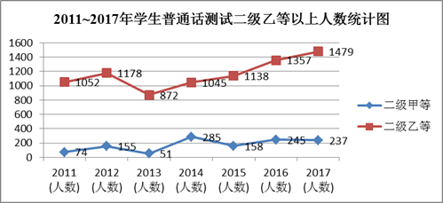 我校自2011年起每年依据上海市语言文字水平测试中心安排,组织一年级新生参加普通话水平测试,至今已历时7年,七年来共有16877名学生参加普通话水平测试,每年约有2500名学生参加测试,校平均分均80分左右,最高分92分(一级乙等),2015年~2017年学生普通话测试平均参考率为91.3%、平均合格率为70%。可喜的是获二级甲等和二级乙等的人数逐年上升(详见2011~2017年学生普通话测试各等级人数统计表、图)。相信通过全校上下共同努力,以后会获得更好的成绩。