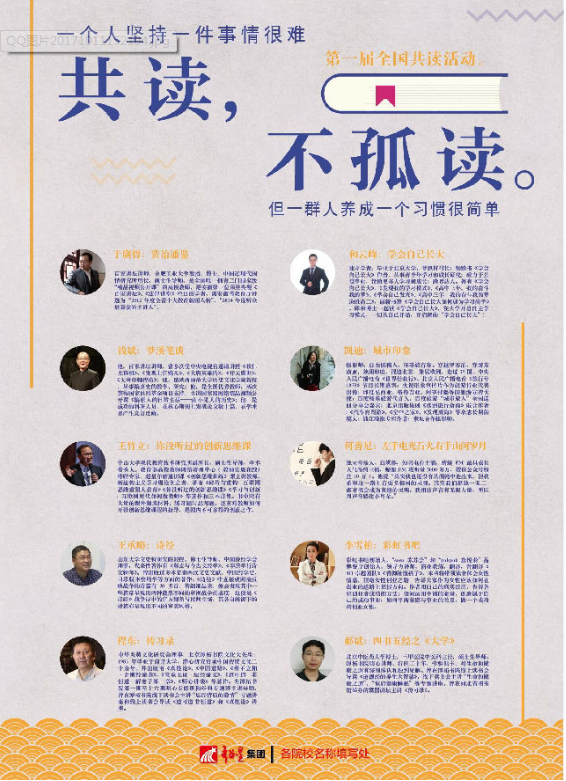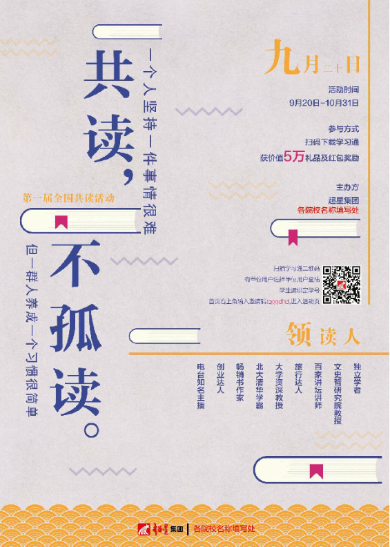 由超星集团主办的“第一届全国共读活动”正式启动。本次阅读活动在全国范围内举行,读者通过手机下载安装“学习通”进入活动页,根据自己的喜好选择共读小组,领读人每日导读,发布当日共读内容,小组内成员一起阅读。领读人通过文字讨论、录音、直播等方式与读者互动,深层次解析书目内容、分享个人经历、交流读书心得、讨论热门话题、解答读者疑问;读者可参与签到、写读书笔记、小组活动等方式和领读人进行互动。我校图书馆积极组织师生积极参与这场有意义的全国共读活动。这项新颖的读书活动将会从9月20日一直持续至10月31日。