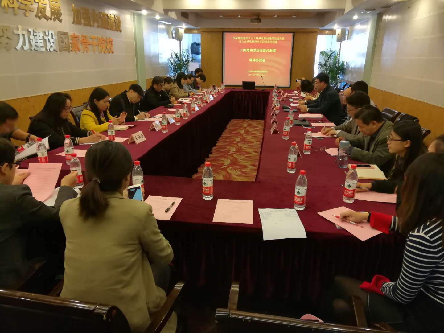 2017年10月28日上午,由上海高职高专思政联盟主办的“全面推进党的十九大精神进教材进课堂进头脑,着力提升思想政治理论课教学质量”为主题的集体备课会在上海出版高等专科学校举行。会议由全国思想政治理论课建设联盟秘书长、上海电子信息职业技术学院副书记副院长顾剑锋主持,上海市学生德育发展中心王振雷老师出席并讲话,上海高职高专思政建设联盟会长、上海理工大学党委副书记、上海上海出版印刷高等专科学校党委书记刘道平教授作了总结发言。全市17所高职高专30多位思政课教师参加集体备课会。