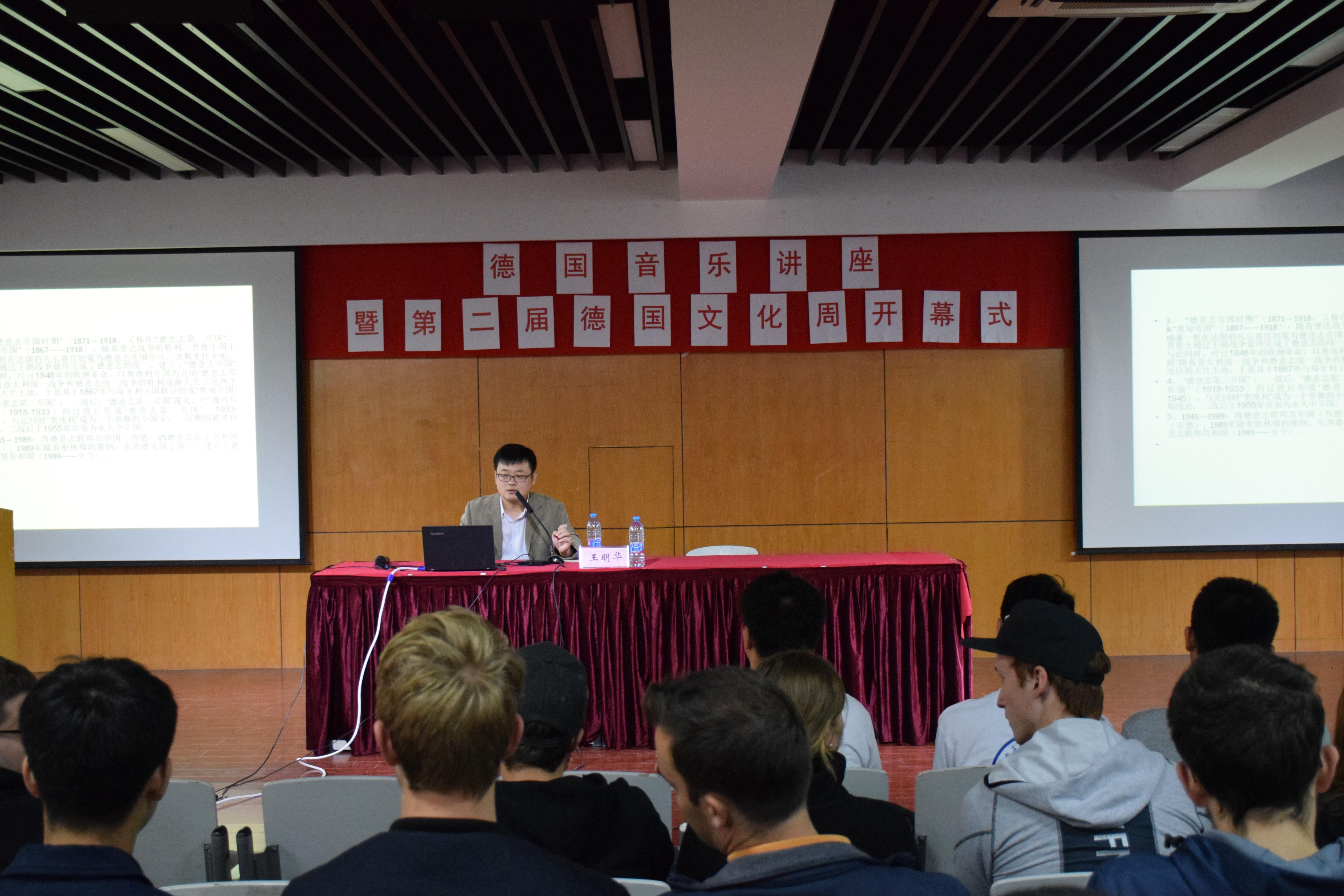 开幕式结束后,德国文化周正式拉开序幕,由来自上海音乐学院的王明华老师,给师生们带来精彩的德国音乐文化讲座,主要围绕“德国音乐发展史”这一核心脉络,分别从德国音乐的情感本质和德国音乐的起源入手,为我们介绍了德国作曲家海顿创作的德国国歌和作曲家贝多芬、瓦格纳的音乐作品,一段段富有德国特色的音乐片段与一曲曲歌剧作品,令师生们印象深刻、意犹未尽。