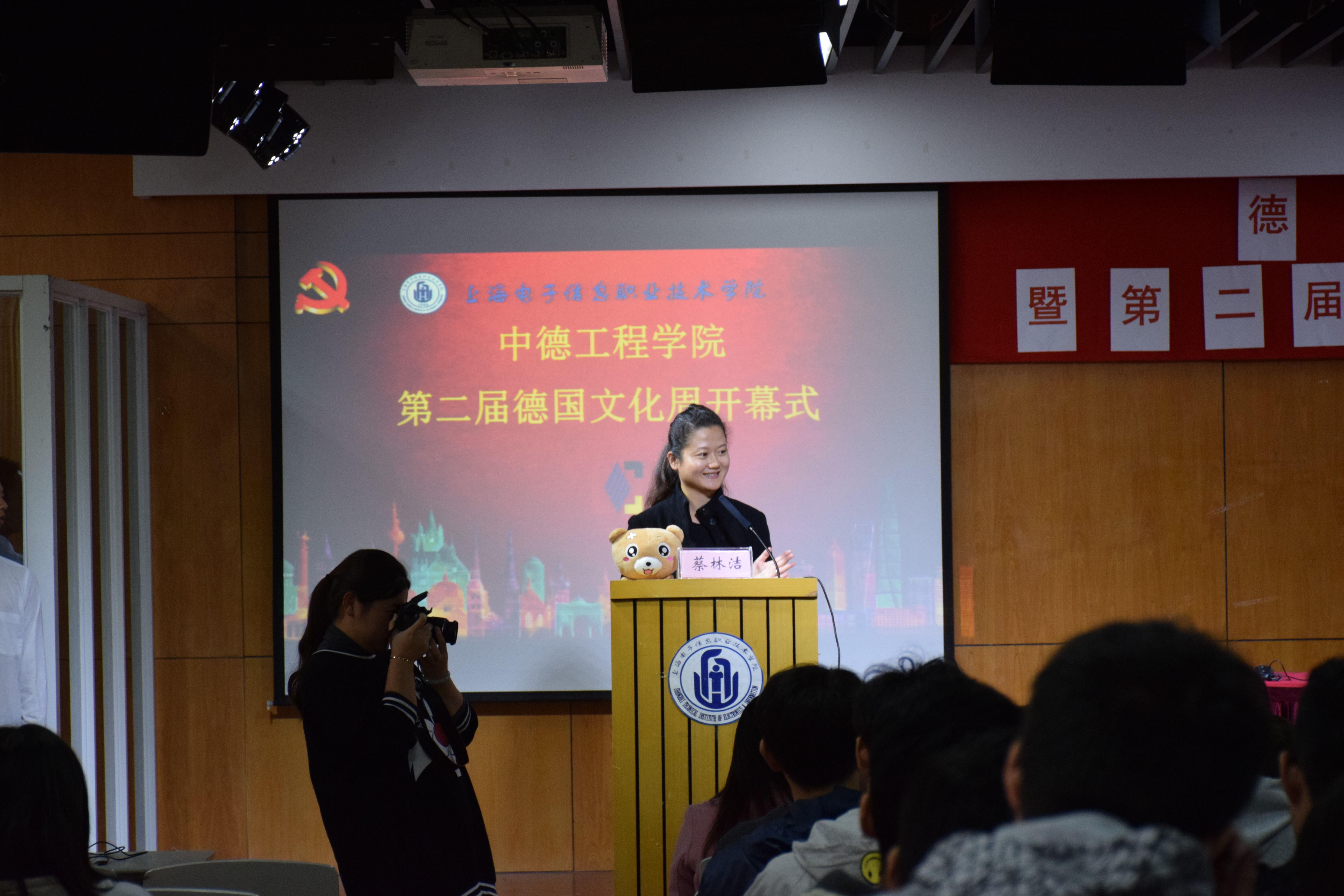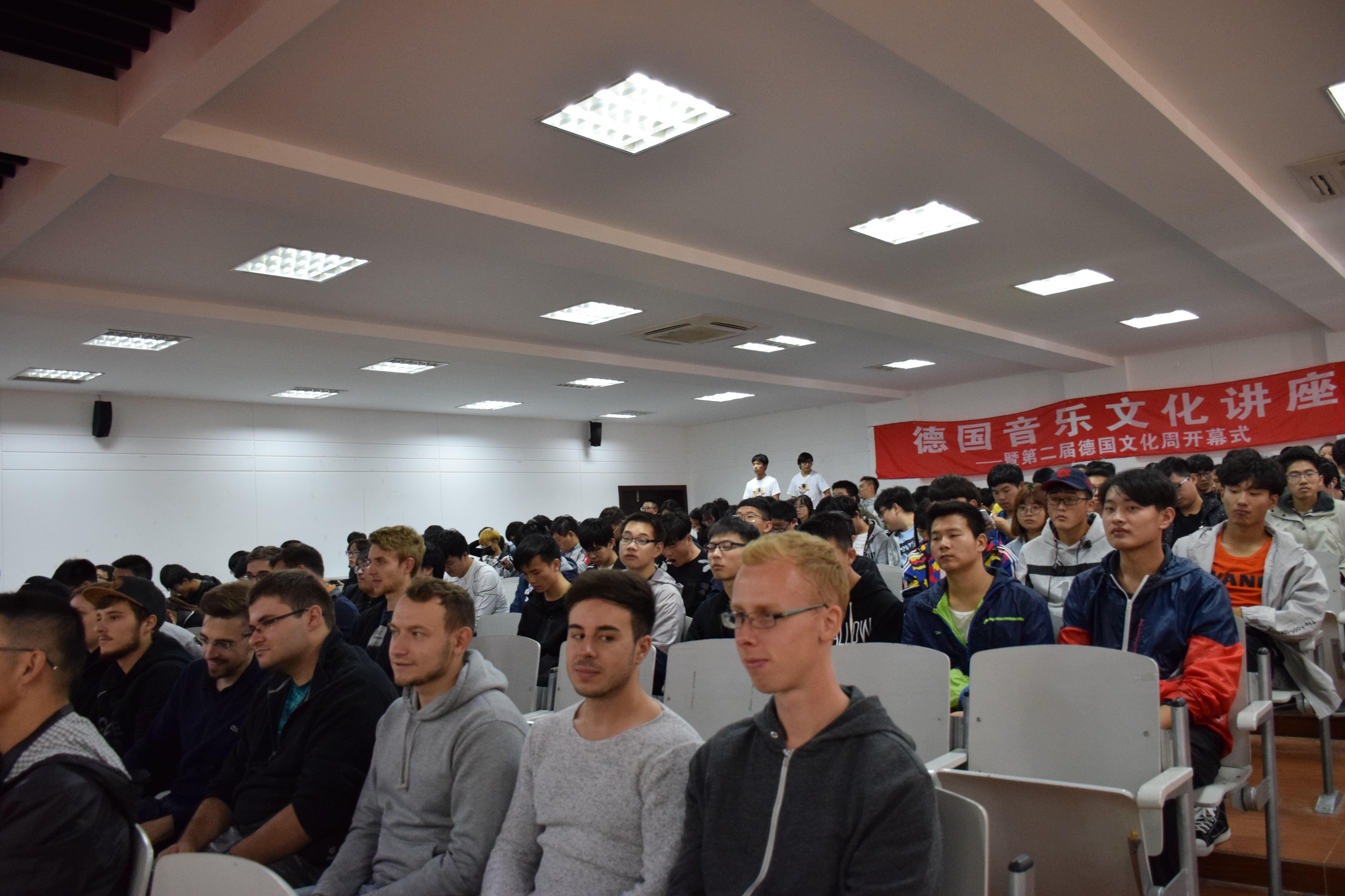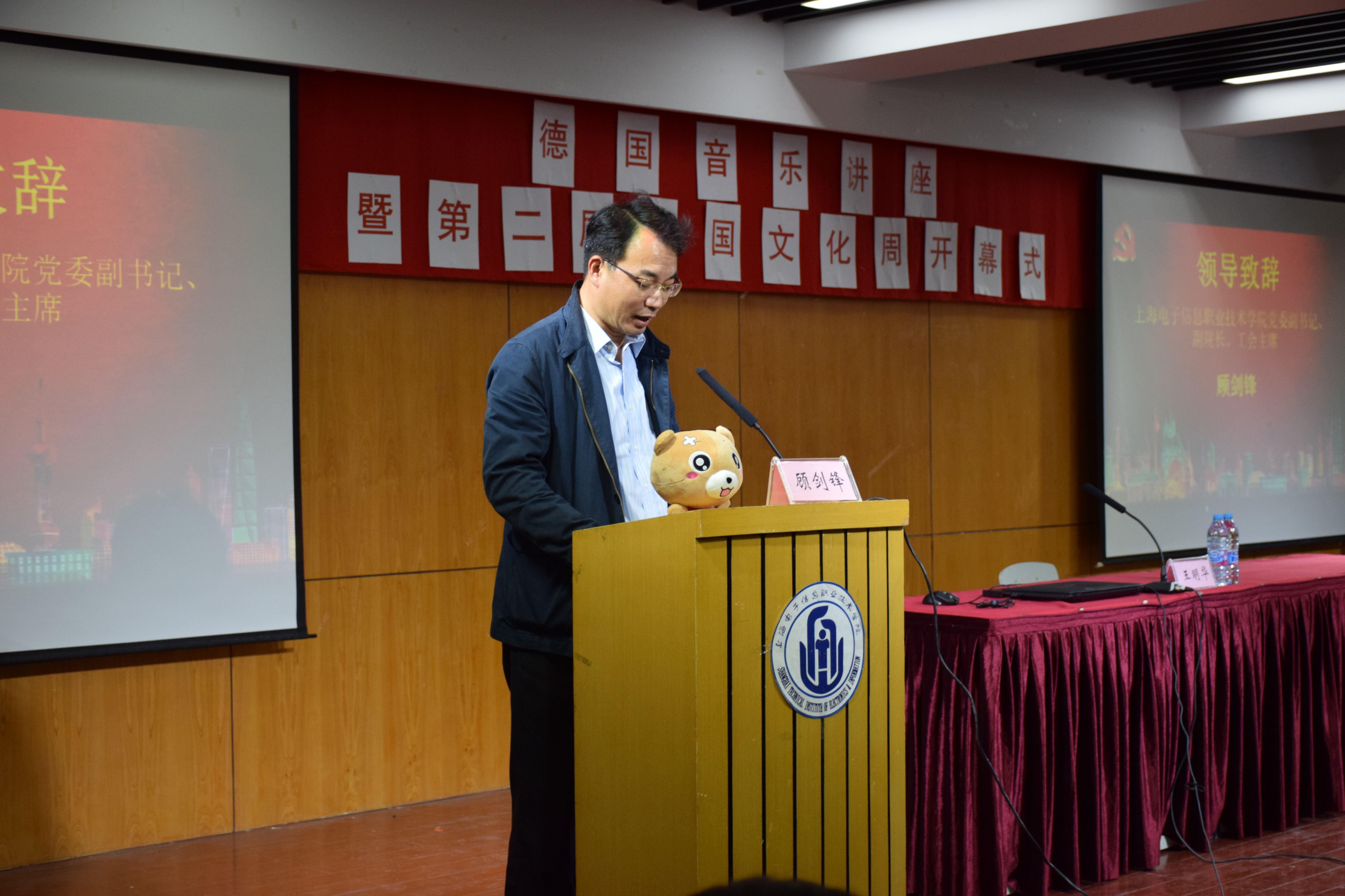 2017年10月30日中午,由上海电子信息职业技术学院中德工程学院党总支主办的德国音乐讲座暨第二届德国文化周开幕式在I 401教室隆重举行。学校党委副主席、工会主席、副校长顾剑锋老师,中德工程学院院长林军老师,中德工程学院副院长张峻颖老师、各党总支书记、德国兰茨胡特应用技术的交流生和全校师生250余人参加,开幕式由中德工程学院党总支副书记、副院长蔡林洁老师主持。