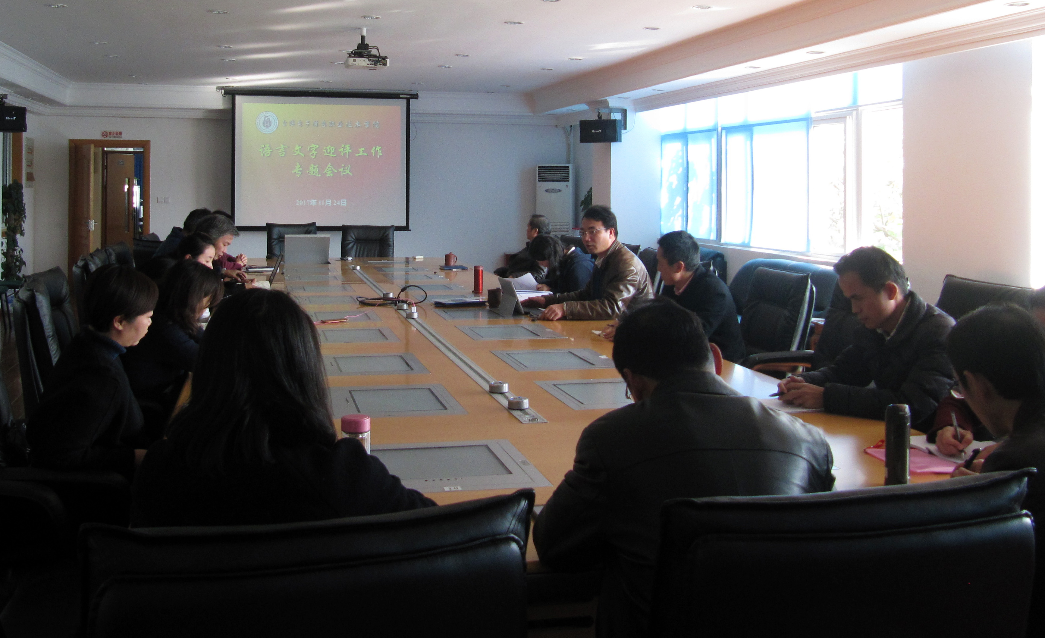 2017年11月24日,语言文字迎评工作专题会议在奉贤校区B205召开。会议由教学副院长窦争妍主持,党委副书记副院长顾剑峰、语委办成员、各二级学院及职能部门语言文字联络员出席会议。