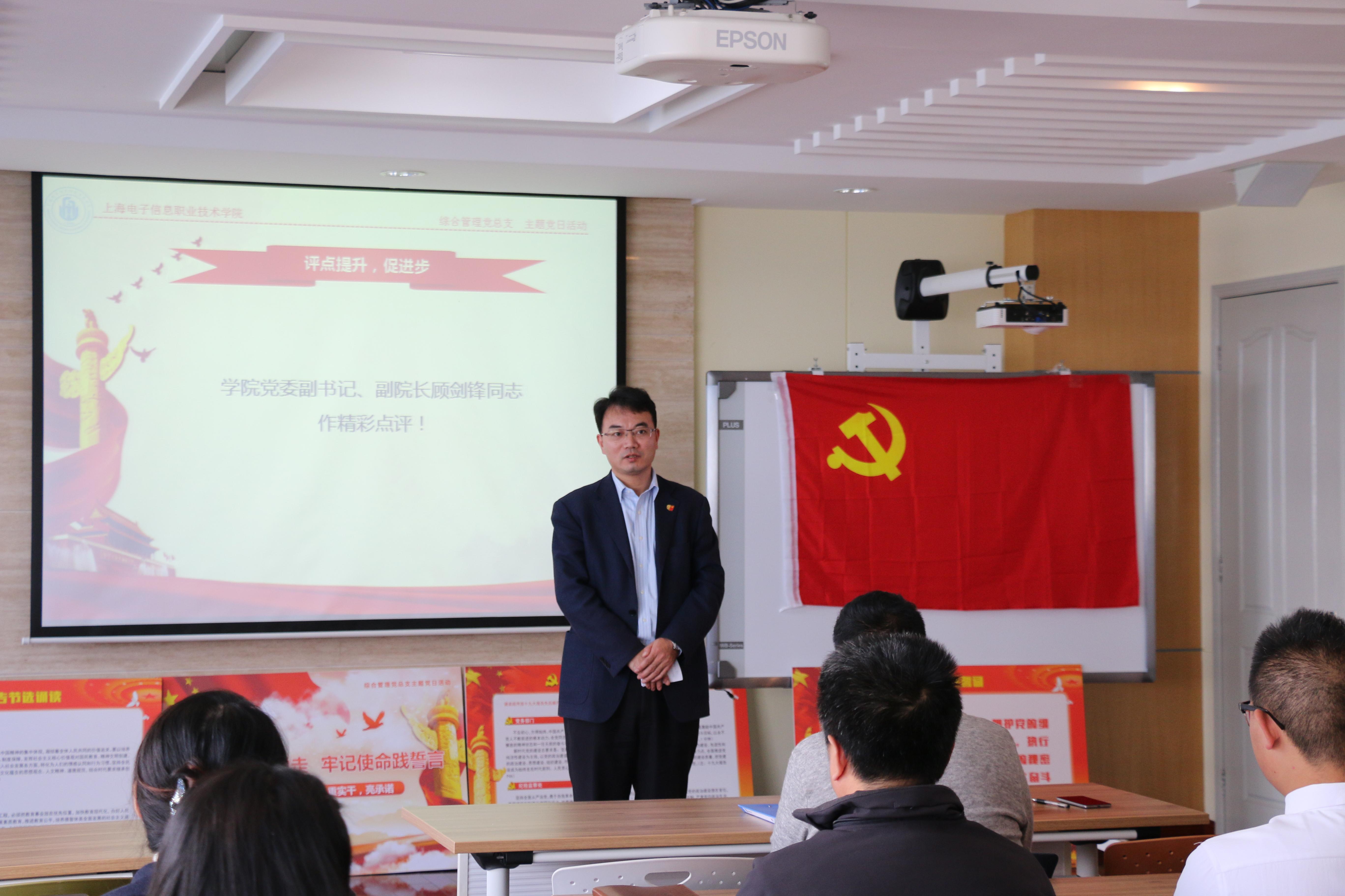 最后学校党委副书记、副校长顾剑锋同志对本次活动进行了精彩点评。他表示,本次活动举办的非常之有意义,令人深受感动。他指出,作为党员,要按照新时代、新思想、新征程的要求来开启学校的新篇章,要把十九大报告精神和本地区、本单位、本部门、本职岗位以及本人思想这“五本”相结合,从每一件为师生服务的小事开始,将各自的承诺转化为正能量,传播给整个校园,乃至播撒到整个社会,担当起新时代赋予我们的使命。