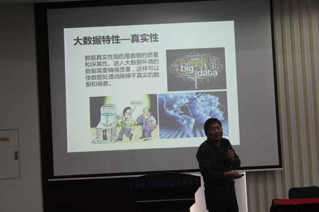 胡院长的报告以“大数据与创新思维培养”为主题,首先以一段视频表示大数据离我们并不遥远,我们在不知不觉中已成为“数字人”,而对大量的人机数据进行捕捉、存储和分析,并根据这些数据作出预测的能力就是我们所说的大数据。胡院长告诉同学们大数据有五种特性:容量、速率、多样性、真实性、价值,他表示每个网民都是数据的生产者。