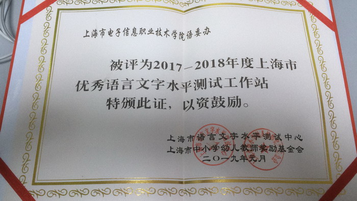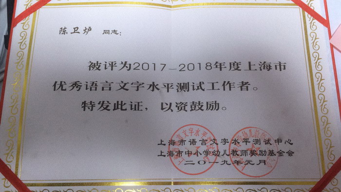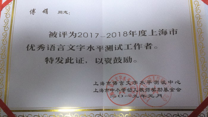日前,上海市语言文字水平测试中心、上海市中小学幼儿教师奖励基金会联合下发《关于表彰2017—2018年度“上海市优秀语言文字水平测试工作站和测试工作者”的通知》(沪语测〔2019〕3号),我校被授予“上海市优秀语言文字水平测试工作站”荣誉称号。学校青年教师傅娟、陈卫炉获评“上海市优秀语言文字测试工作者”。