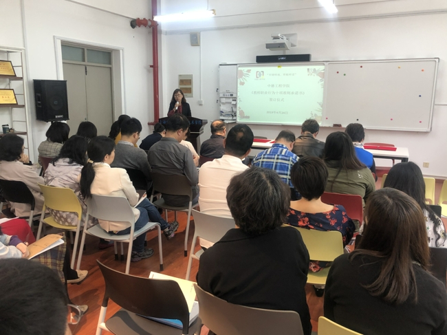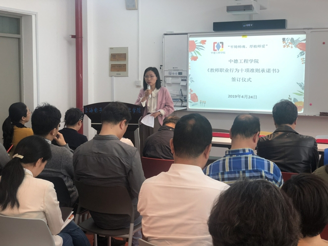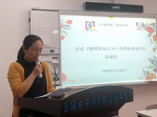 为贯彻全国和上海市教育大会精神,贯彻《国家职业教育改革实施方案》等文件要求,落实立德树人根本任务,健全师德师风建设长效机制,2019年4月24日,中德工程学院组织全体教师集中签订《上海电子信息职业技术学院教师职业行为十项准则承诺书》。
