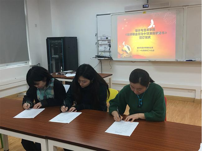 在中心组(扩大)学习会结束以后,教师更加明确了在自己的岗位上除了教书育人,更是需要落实立德树人的根本任务。鲁家皓、王西贝、赵莹三位系主任作为教师代表在签订仪式上共同宣读了《教师职业行为十项准则承诺书》,全体专任教师和辅导员先后在承诺书上签上了自己的名字。