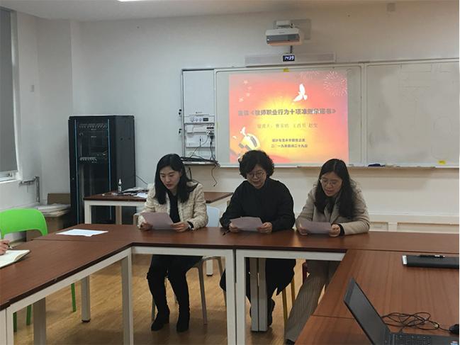 高晓昧副书记首先宣读了市纪委监委驻市教育卫生工作党委纪检组《关于“五一”期间严格落实中央八项规定精神,纠正“四风”工作的通知》,她强调,虽然此次针对的是党员干部,但是我们的特殊岗位特殊人群,也会遇到类似情况,加强学习以起到警示作用。节假日是腐败问题高发期,所有人员必须高度重视,提高警惕性,以身作则,严守纪律。紧接着设计与艺术学院党总支纪检委员王静芳在会上带领大家共同学习了上海市公开曝光的违反中央八项规定精神的典型案例,通过案例的学习,结合我们自身的岗位和环境,大家也做了学习感想的讨论。