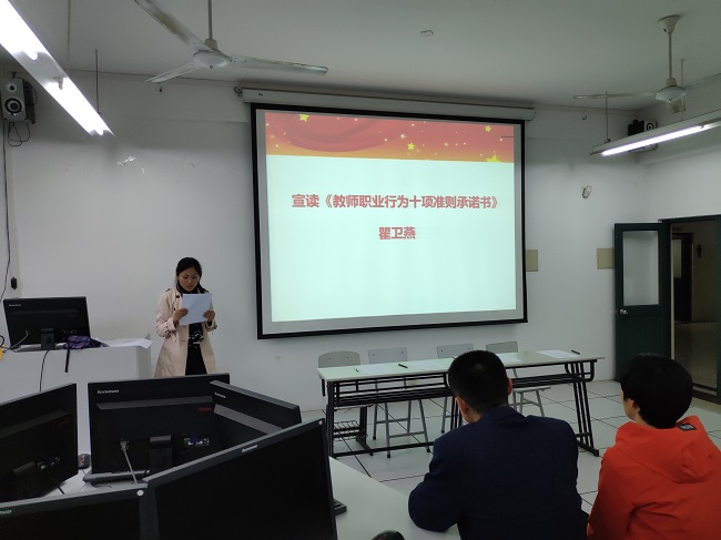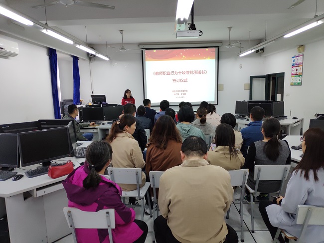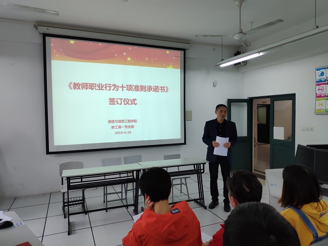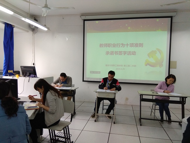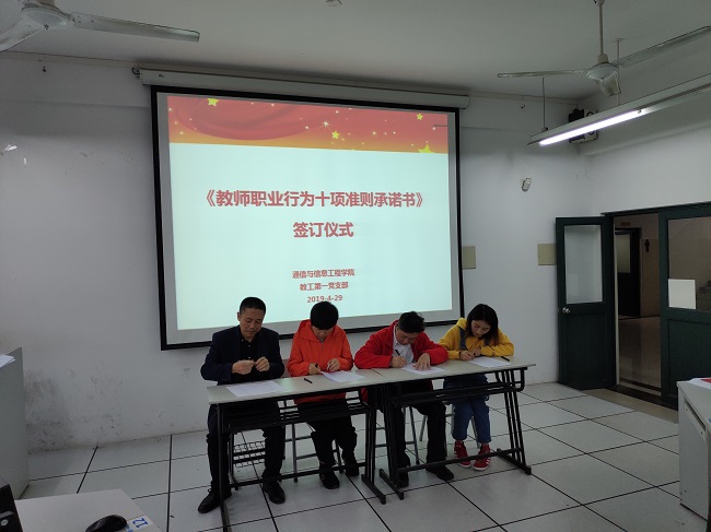 教育发展,教师为本;教师素质,师德为本。为进一步加强师德师风建设,让每位教师规范职业行为,明确师德底线,塑造“以德树人,为人师表”的良好形象,2019年4月29日,通信与信息工程学院以党支部为单位组织全体教职工开展师德师风教育活动暨《教师职业行为十项准则承诺书》签字仪式。