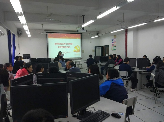 为使本次活动有效开展,通信与信息工程学院党总支高度重视、精心部署。活动前,党总支通过“通信党建微信群”转发了《教育部关于印发〈新时代高校教师职业行为十项准则〉的通知》(教师[2018]16号文),要求学院党政领导、党支部书记自觉带头学习、充分领会文件精神;活动中,党政领导班子成员到各自负责联系的党支部参加签字仪式并发言。党政领导班子成员要长期坚持通过课堂听课、学生座谈等途径广泛了解、及时发现和纠正可能存在的师德师风问题。