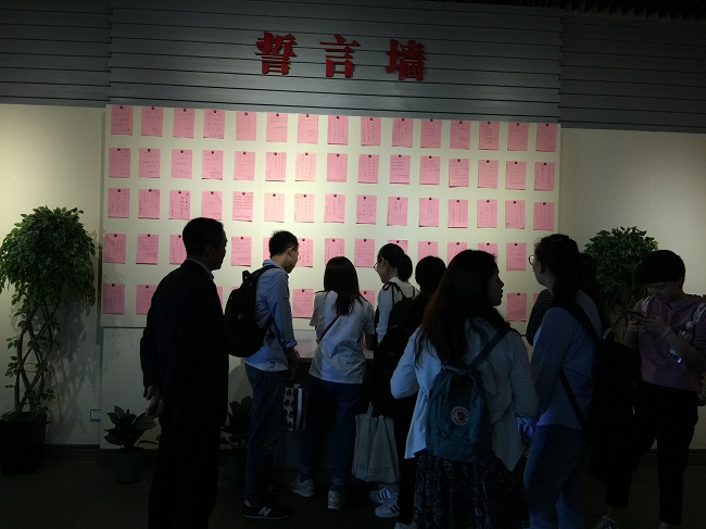 整个展览从“探索救亡图存的道路”“中国共产党成立”“十三位代表生平事迹介绍”“进行新民主主义革命”“建设社会主义新中国”“走中国特色社会主义道路”六个部分,通过丰富的文史图片和影像资料,全面铺开了中国共产党近百年战斗历程的生动历史画卷,系统地展现了共产党人为争取民族解放、国家独立而矢志不渝的革命战争史,以及为实现国家富强、民族复兴而不懈努力的建设奋斗史。一件件文物、一段段影音、一幕幕场景,引得大家时而凝思细观、时而讨论交流,对中国共产党艰辛而伟大的革命历史有了更深入的认识,对“红船精神”有了更深刻的感悟,爱党爱国之情也油然而生,激动地在誓言墙上写下了肺腑之言。