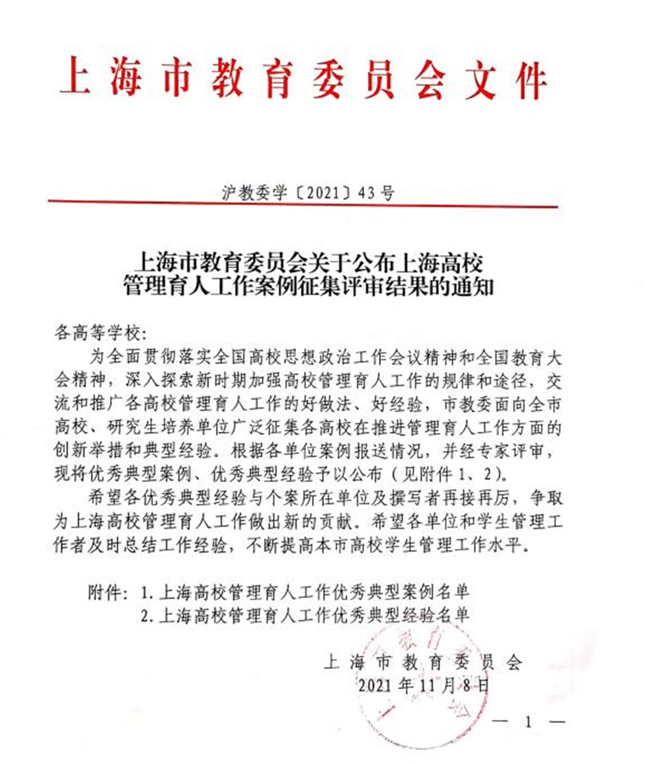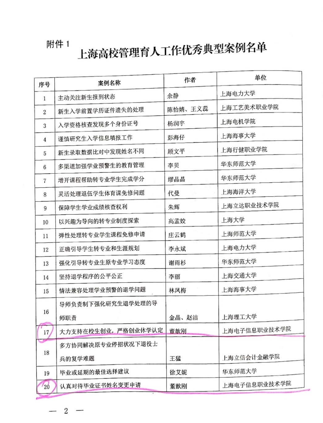 日前,上海市教委面向本市所有高校组织案例征集活动,根据其下发的《上海市教育委员会关于公布上海高校管理育人工作案例征集评审结果的通知》(沪教委学〔2021〕43号),我校教务处申报的《大力支持在校生创业,严格创业休学认定》《认真对待毕业证书姓名变更申请》两项案例成功入选上海高校管理育人工作优秀典型案例。