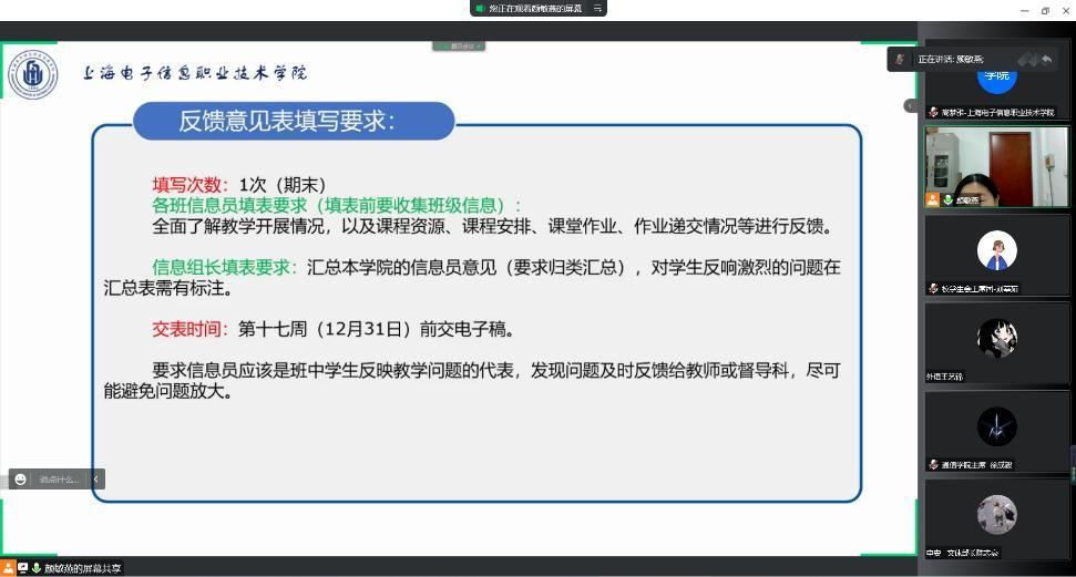 12 月 12 日,教务处通过线上方式召开了学生教学信息员组长会议。会议由教务处教学督导科科长颜敏燕主持,教务处见习教师高梦雅、校学生教学信息员主席、校(院)学生教学信息组长出席了会议。