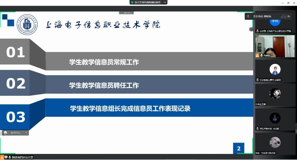 会上,颜敏燕老师介绍了学生信息员组长的主要职责,布置了教学信息组长本学期工作的要求和具体内容,说明了学生信息员关于教学信息及时反馈的重要性,强调当遇到问题时要尽快联系老师。同时,向各学院信息员组长阐述了本学期学生信息员聘任的流程和方式,以及各学院组长提交相关汇总材料的方式和截止时间。最后还介绍了督导科语言文字以及教学评教等工作内容的基本情况。
