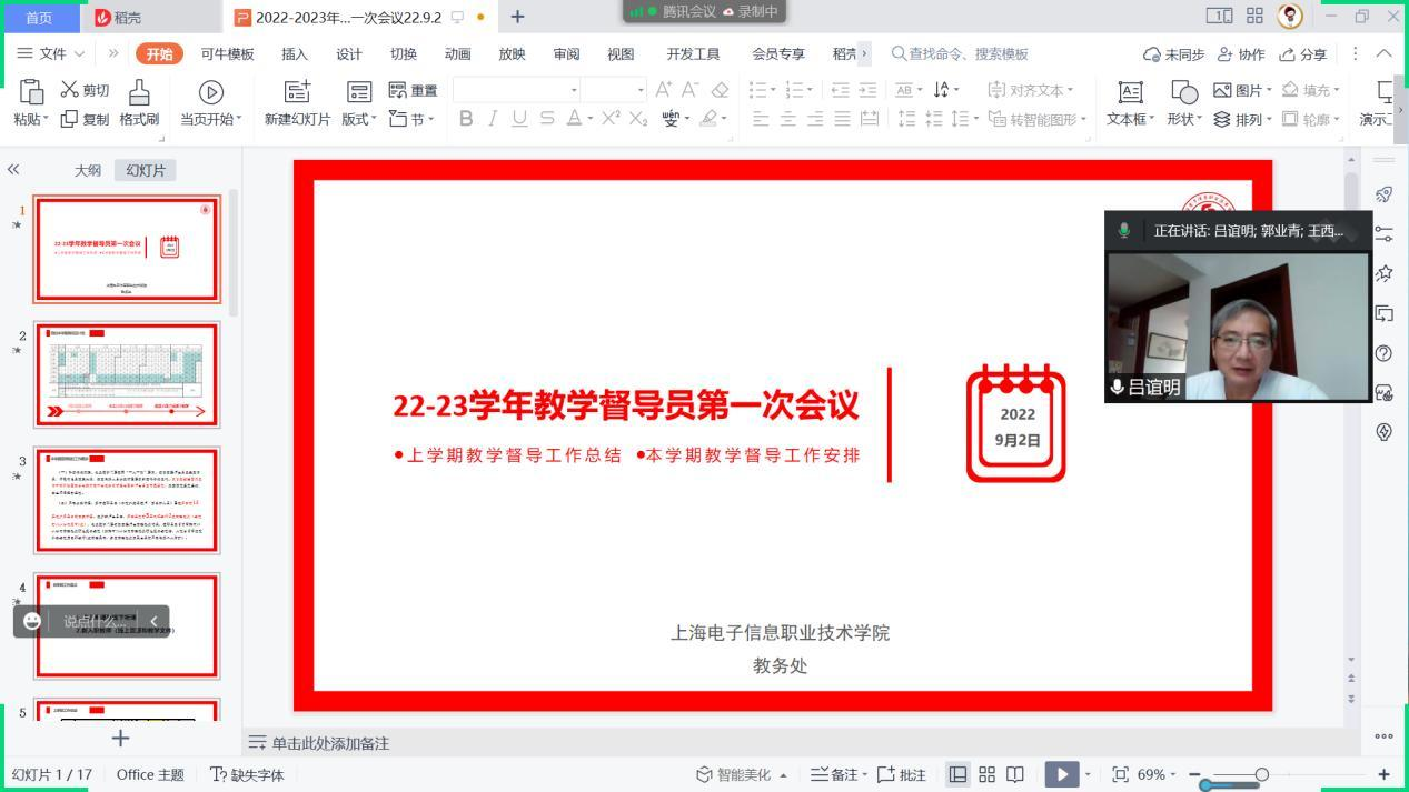 会上教务处处长陈克明介绍了新学期开学计划、疫情防控工作要求和新学期工作重点,他强调要切实发挥教学督导“监督、检查、评估、指导”的作用。教务处副处长王西贝对上学期教学督导工作进行了总结并介绍了线上查课听课方法和流程。谢慧玲老师布置了新学期工作的任务分配和具体细节要求。