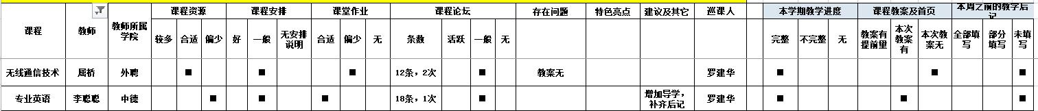 本学期开学初,学校的教学工作继续在线上开展,二级教学督导工作按照学校“覆盖所有教师、所有课程”的要求进行巡课。学院要求督导老师们尤其要关注新教师的线上教学情况,对新教师在课程安排、教学资源、课堂讨论、作业和教学文件等方面进行全方面的检查和记录。学院每天会将学校督导和二级督导巡课的问题及时反馈给新教师和他们的课程对接教师,以促进教师们整改,保证线上教学任务的完成。