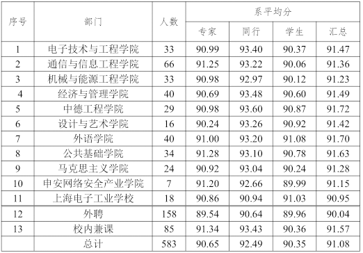2022 年 5 月教务处开展了本学期教师同行、领导网上评教工作。结合学生评教成绩,教务处汇总了评教结果,生成了所有被评教师的学期平均分。本学期全校被评教师共 583 人,其中专任教师 340 人,校内兼课 85 人,外聘 158 人。三维度评教的校平均分 91.08,校最高分 95.34,校最低分 80.25,各部门平均分详见表 1。
