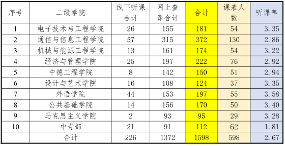 本学期督导工作从 2 月 14 日开学至 5 月 20 日截止,即第一周至第十四周的教学周期间。全校共督导查课人数为 1598 人次,课程表人数 598 人,平均查课率为 2.67 次/人,完成全校教师全覆盖督导听课的总目标。听课数最高的二级学