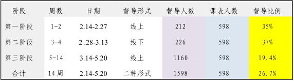 此阶段督导工作重点是确保网上教学的正常进行。督导室要求被查课的教师覆盖面要广、每天每个学院都被查到;其次,以教学资源情况,特别是教学视频量(控制在 50%课时时长)为重要指标进行查课;最后是重点查询课程论坛上师