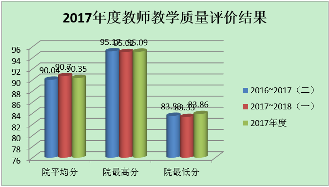 2017年度学院组织开展了4次学生网上评教,本学年学院共有234个班级的所有学生对430位教师进行教学测评,学生测评原始记录约23万余条;教务处组织各教学单位开展了2次同行、领导专家评教工作,汇总整理了本年度每位任课教师的学期和年度的学生、同行、领导专家三方评教数据,按4:3:3的权重分别计算出每位任课教师的学期与年度平均分及排名,并分发给各教学单位。